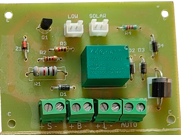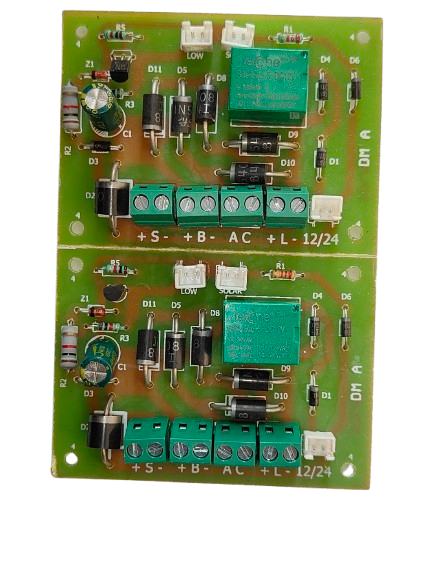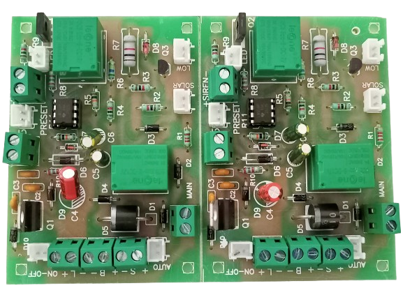 Also called charging PCB. Provides power for Motherboard & Siren PCB. 12/24hr feature that automatically turns off machine during Day and turn on at night. Indicator for Battery Status – Low/Charging